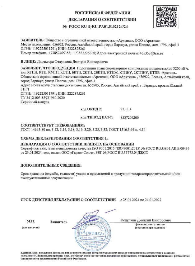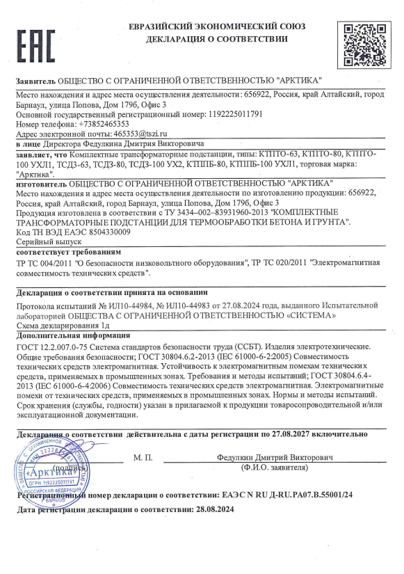 Трансформаторное оборудование, выпускаемое заводом «Арктика» сертифицировано, соответствует Госстандартам РФ и проходит обязательную предпродажную диагностику. На всю продукцию имеются сертификаты соответствия ГОСТ РФ и Декларация о соответствии. Контроль качества на заводе трансформаторного оборудования «Арктика» состоит из двух этапов. На первом этапе осуществляется входной контроль качества материалов и комплектующих. Вторым этапом являются приемо-сдаточные испытания, включающие в себя: