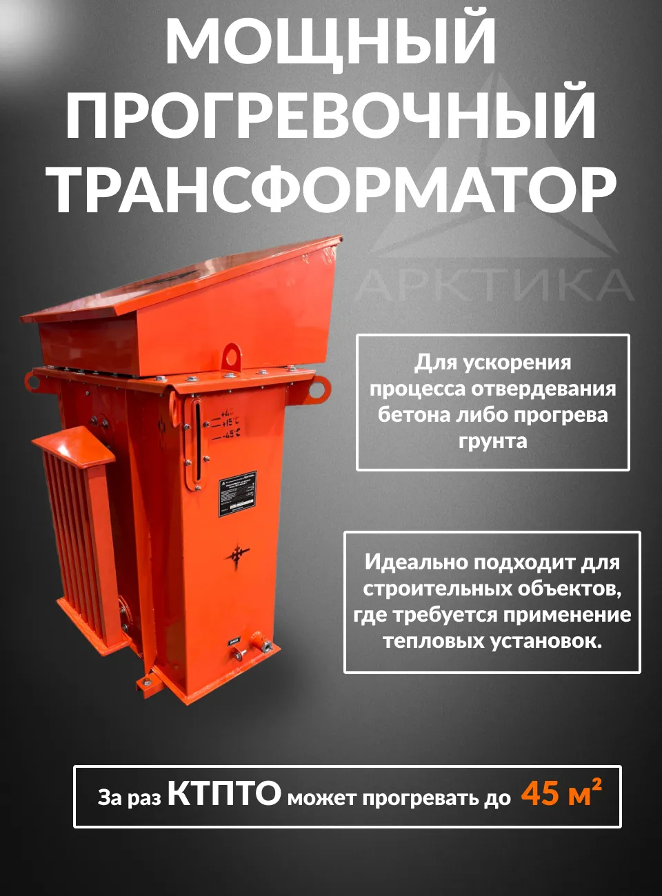 В КТПТО применяется трехфазный трехобмоточный трансформатор типа ТМТО мощностью 80 кВА с естественным масляным охлаждением. Трансформатор имеет 5 ступеней напряжений для обеспечения лучших условий прогрева. В КТПТО имеются блокировки, обеспечивающие безопасность работ обслуживающего персонала при прогреве бетона. Контроль за температурой бетона осуществляет оператор, так же он вручную производит отключение трансформатора при наборе необходимой температуры бетона. Средний объем прогреваемого бетона масляным трансформатором КТПТО - 45 м3.